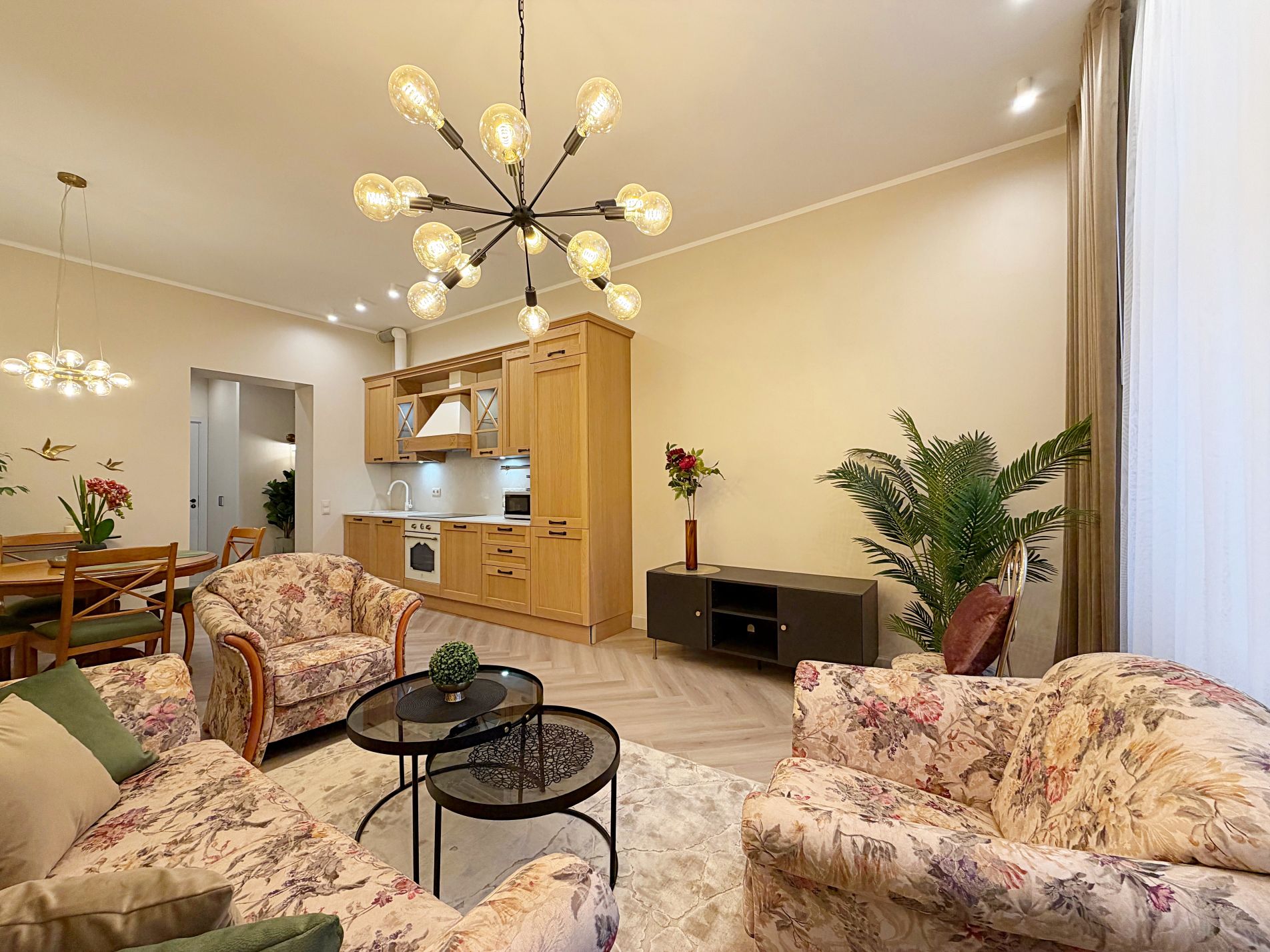 - plaša viesistaba ar iebūvētu virtuvi un visu nepieciešamo sadzīves tehniku, nodalīta ēdamzona un atpūtas zona;