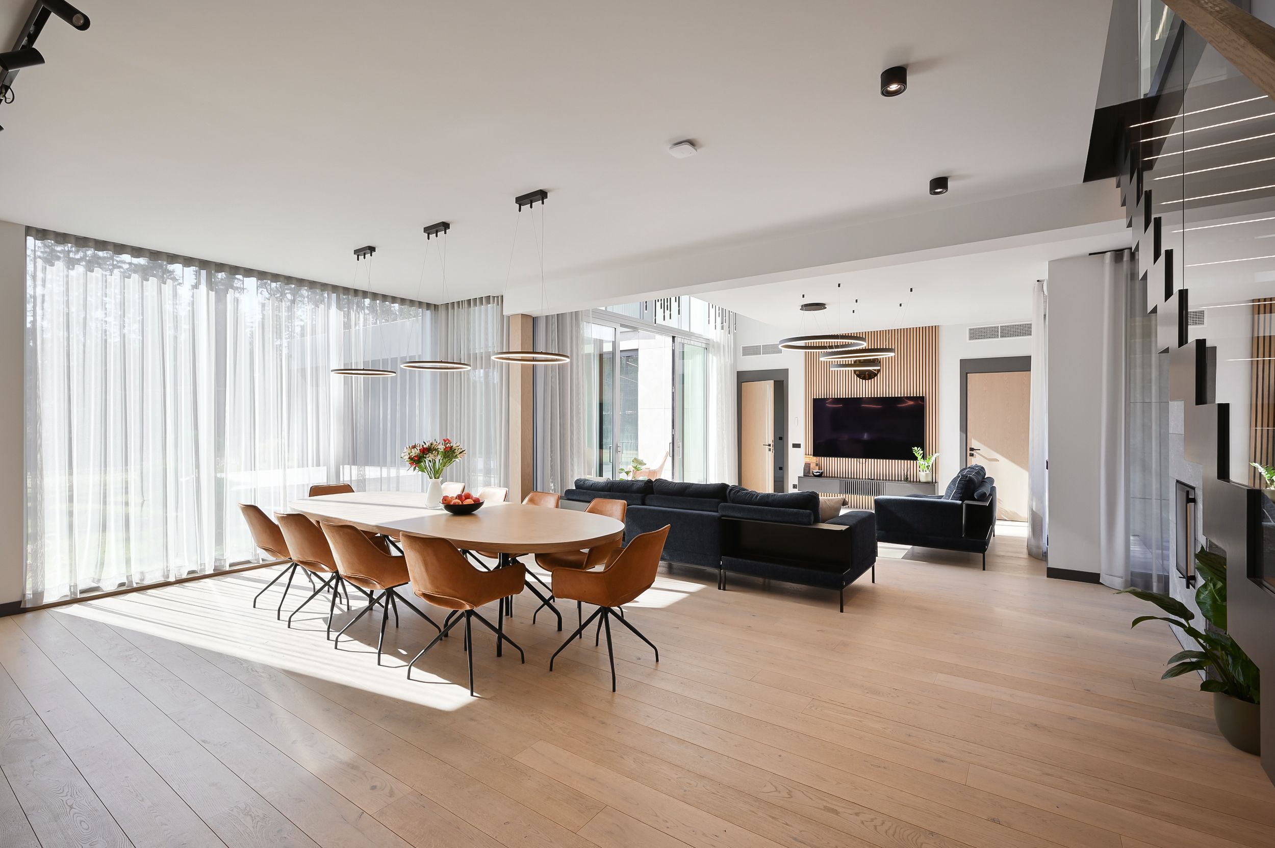Pirmajā stāvā - plaša un gaiša viesistaba ar 6 m augstiem griestiem un panorāmas logiem, viesistaba ir apvienota ar virtuvi un ēdamzonu, kabinets, viesu tualete, SPA un atpūtas zona ar pirti un džakuzi un atsevišķu sanmezglu, noliktavas telpa, tehniskā telpa un priekšnams. Gan no viesistabas, gan SPA zonas ... Lasīt vairāk