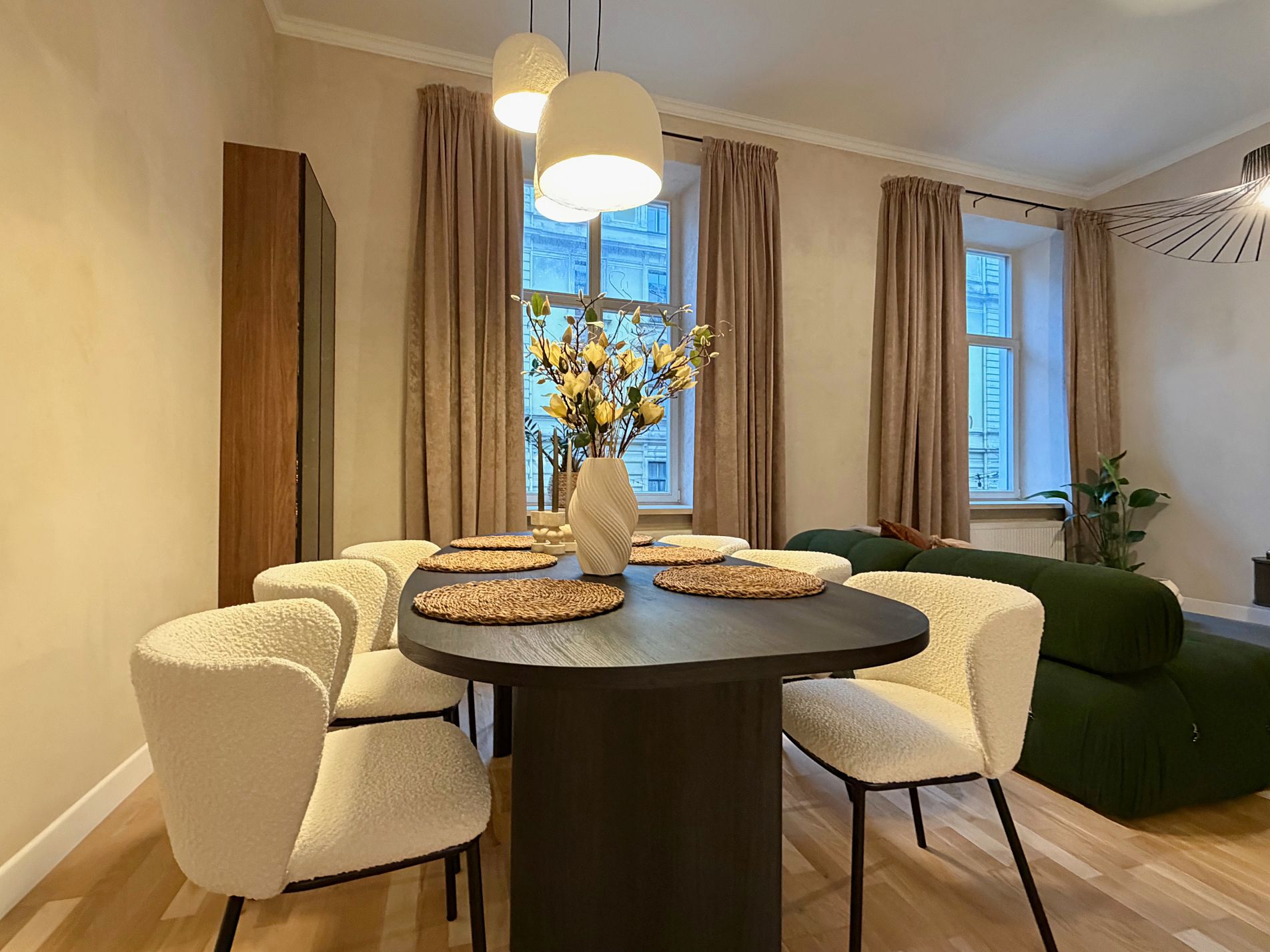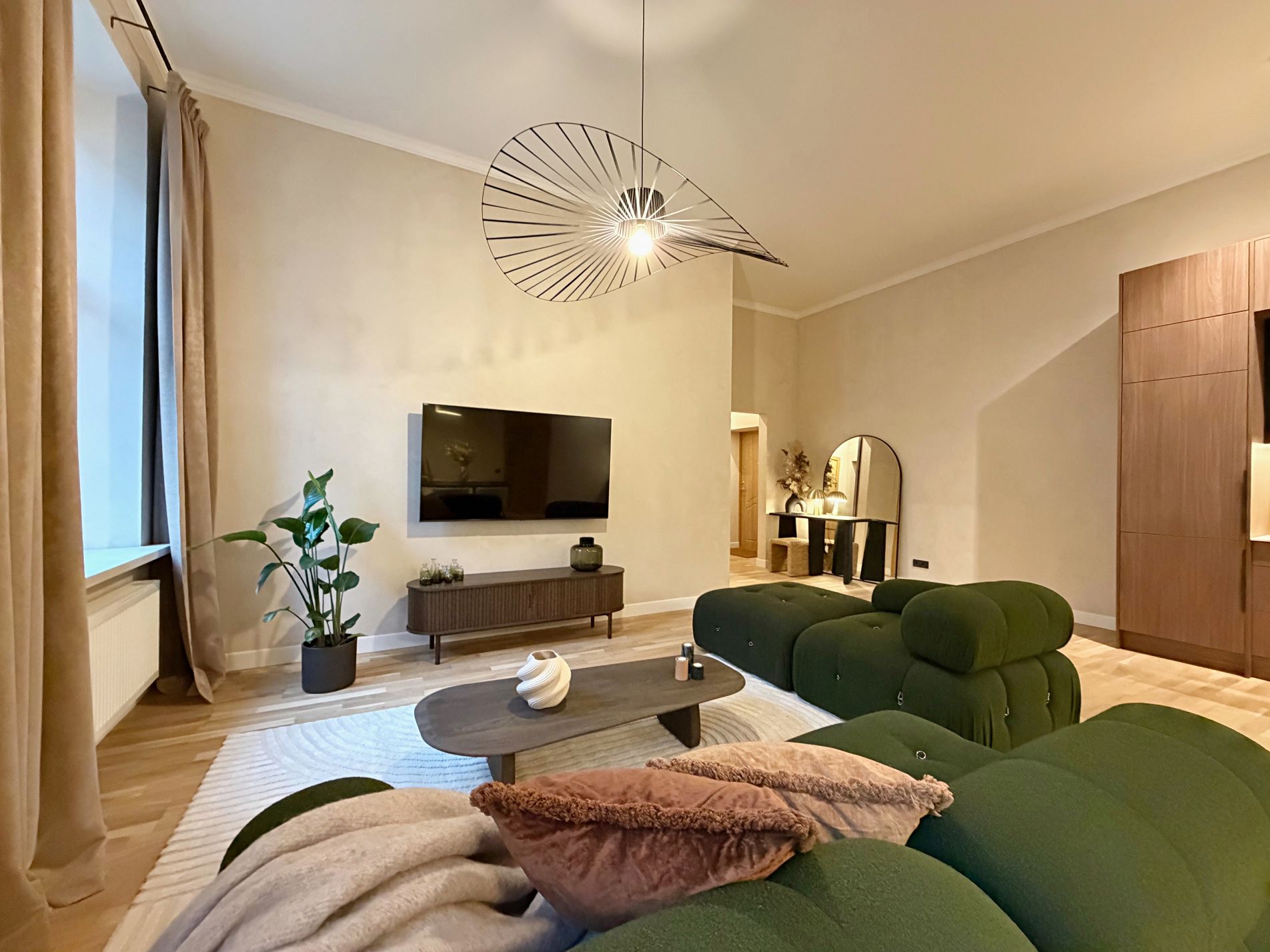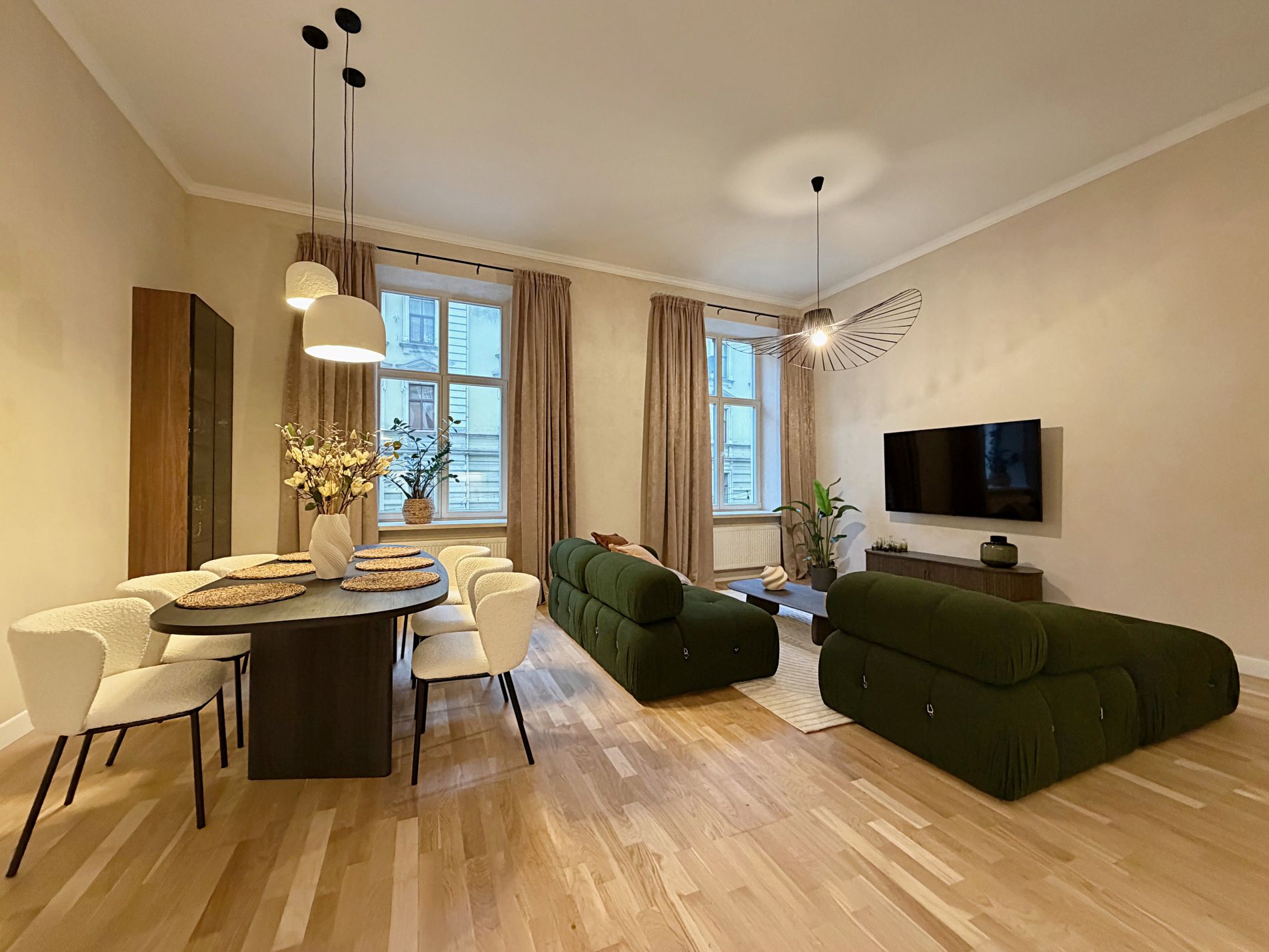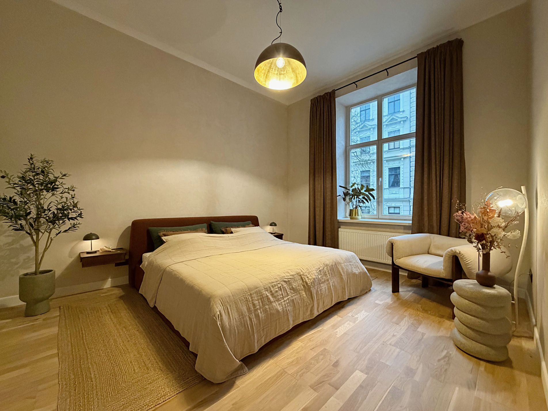 Dzīvoklis ir pilnībā mēbelēts un aprīkots ar augstas kvalitātes mēbelēm un sadzīves tehniku. Augstie griesti, plašie logi un dabīgā parketa grīdas piešķir telpām īpašu eleganci un gaismas sajūtu, savukārt lieliskais plānojums nodrošina ērtu ikdienas funkcionalitāti.