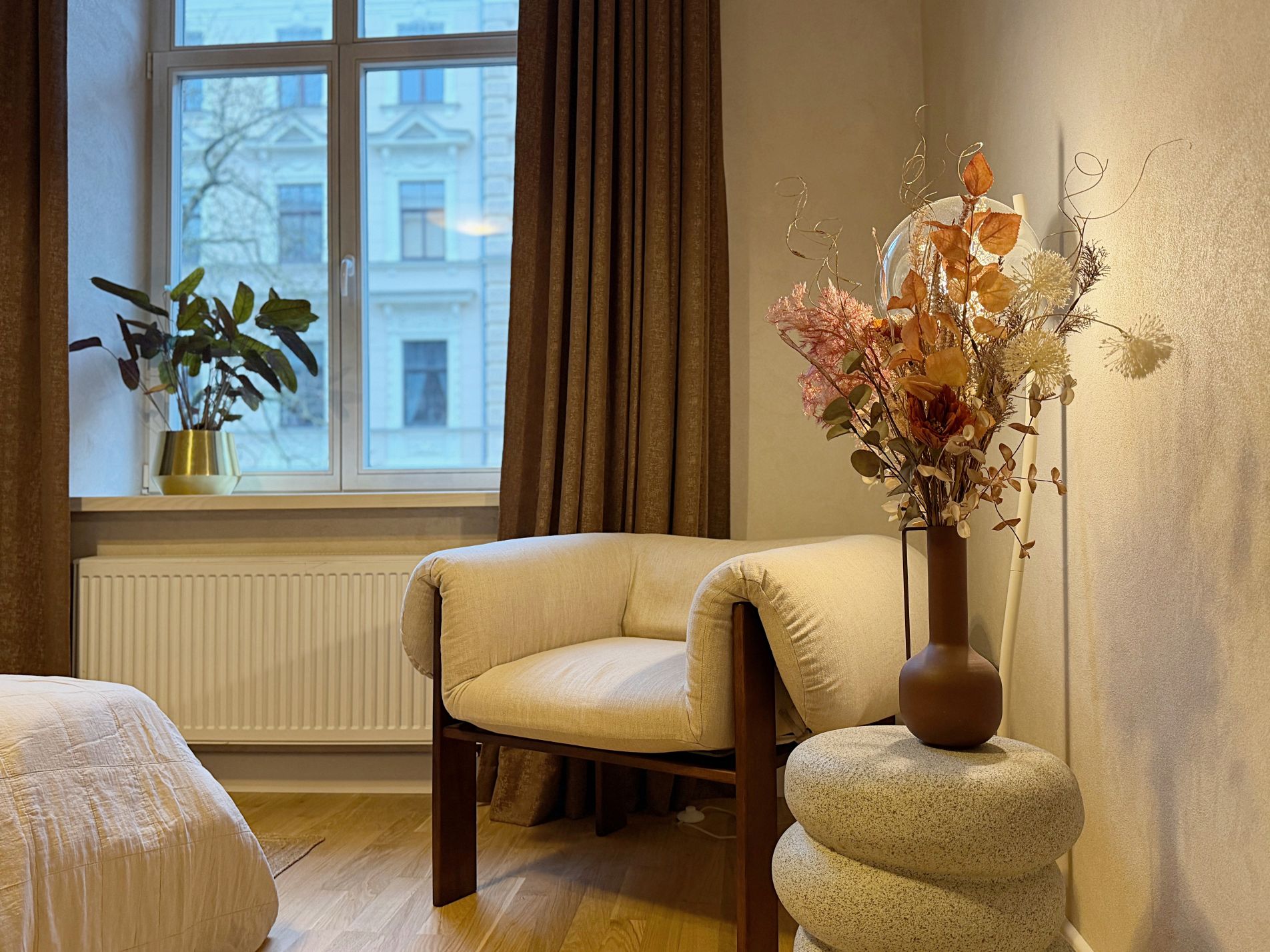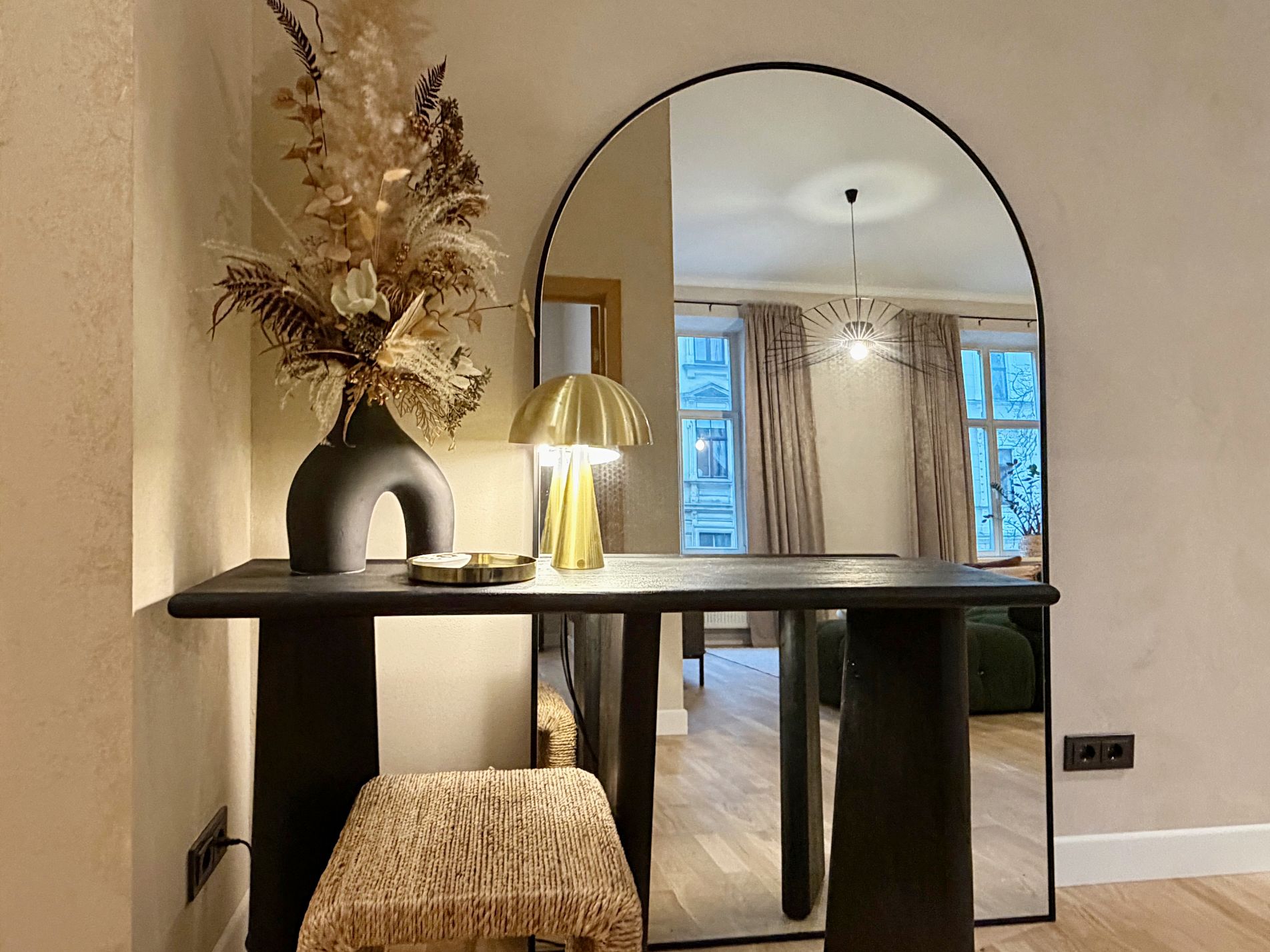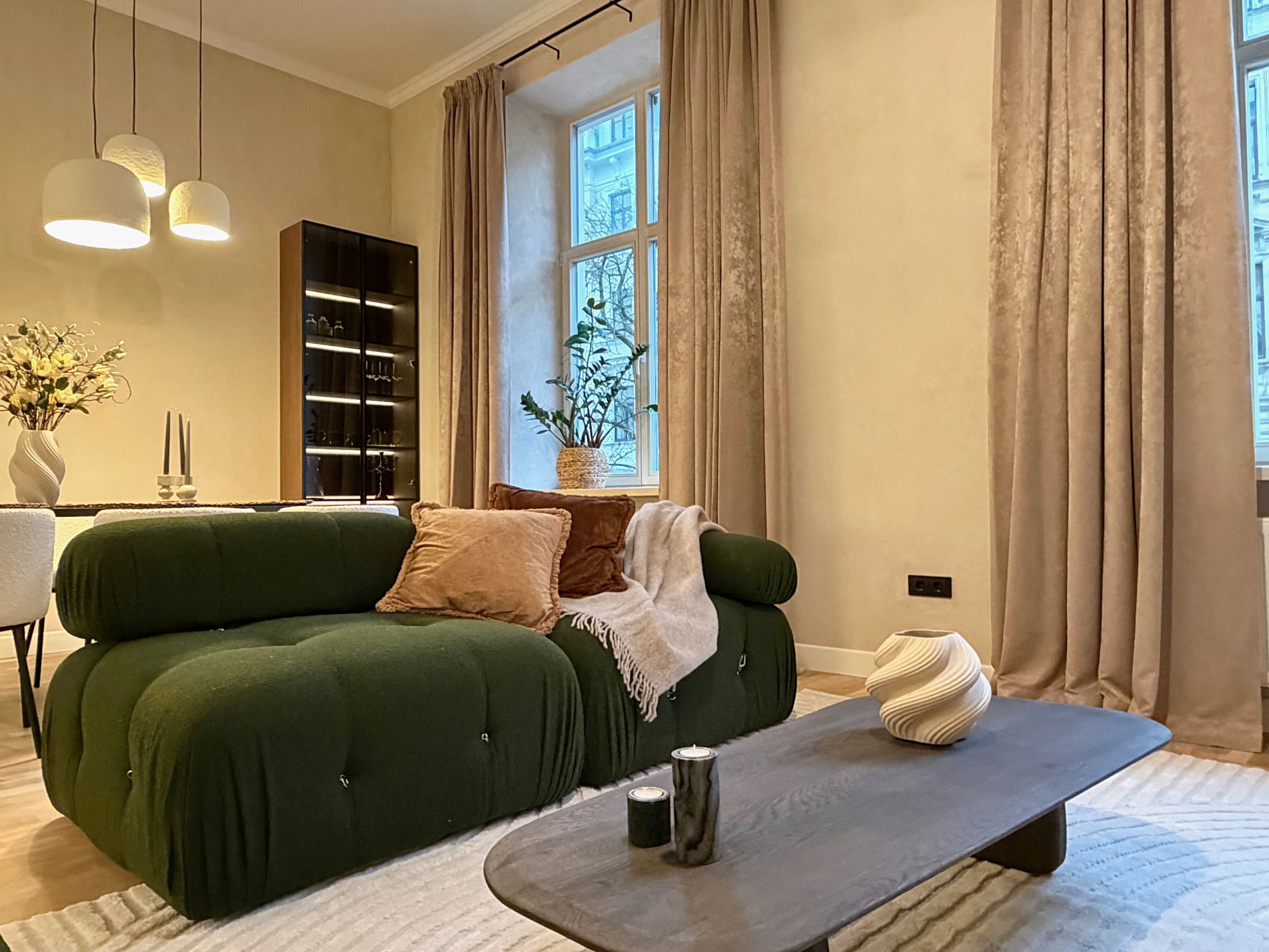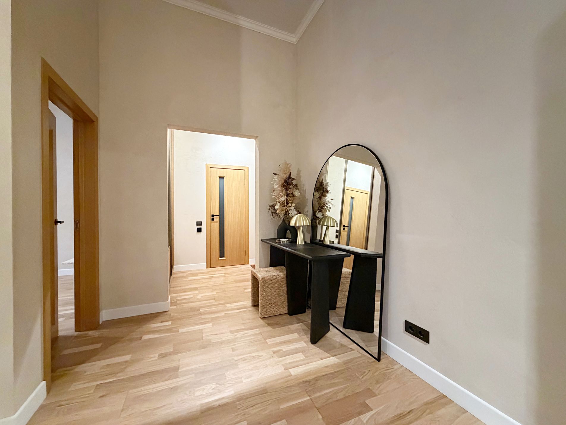 Dzīvoklis ir pilnībā mēbelēts un aprīkots ar augstas kvalitātes mēbelēm un sadzīves tehniku. Augstie griesti, plašie logi un dabīgā parketa grīdas piešķir telpām īpašu eleganci un gaismas sajūtu, savukārt lieliskais plānojums nodrošina ērtu ikdienas funkcionalitāti.