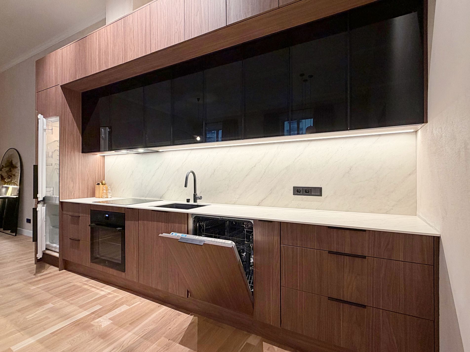 pilnībā aprīkota iebūvēta virtuve ar visu nepieciešamo sadzīves tehniku,