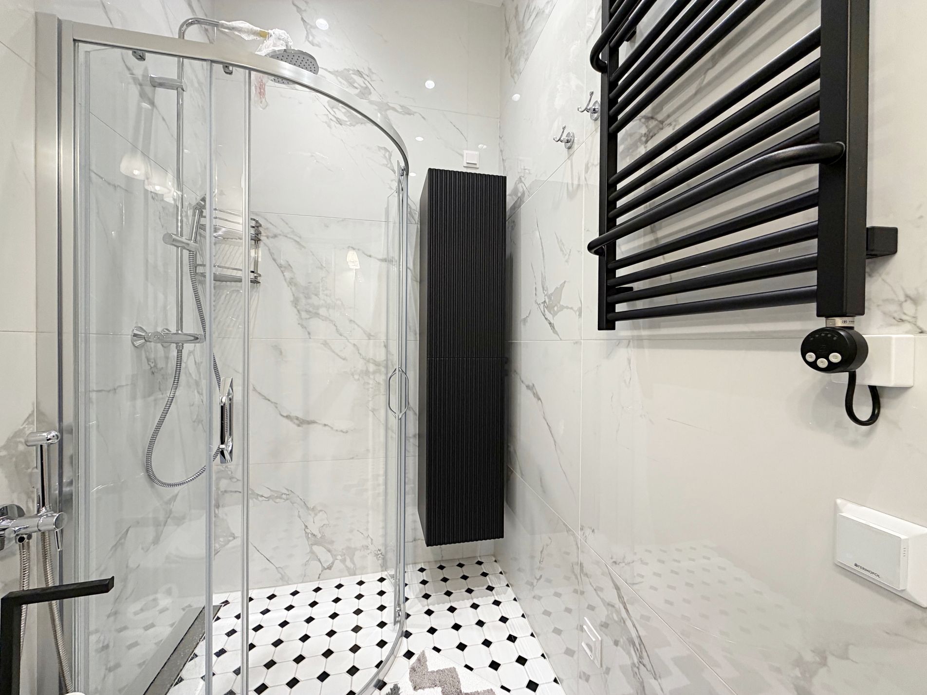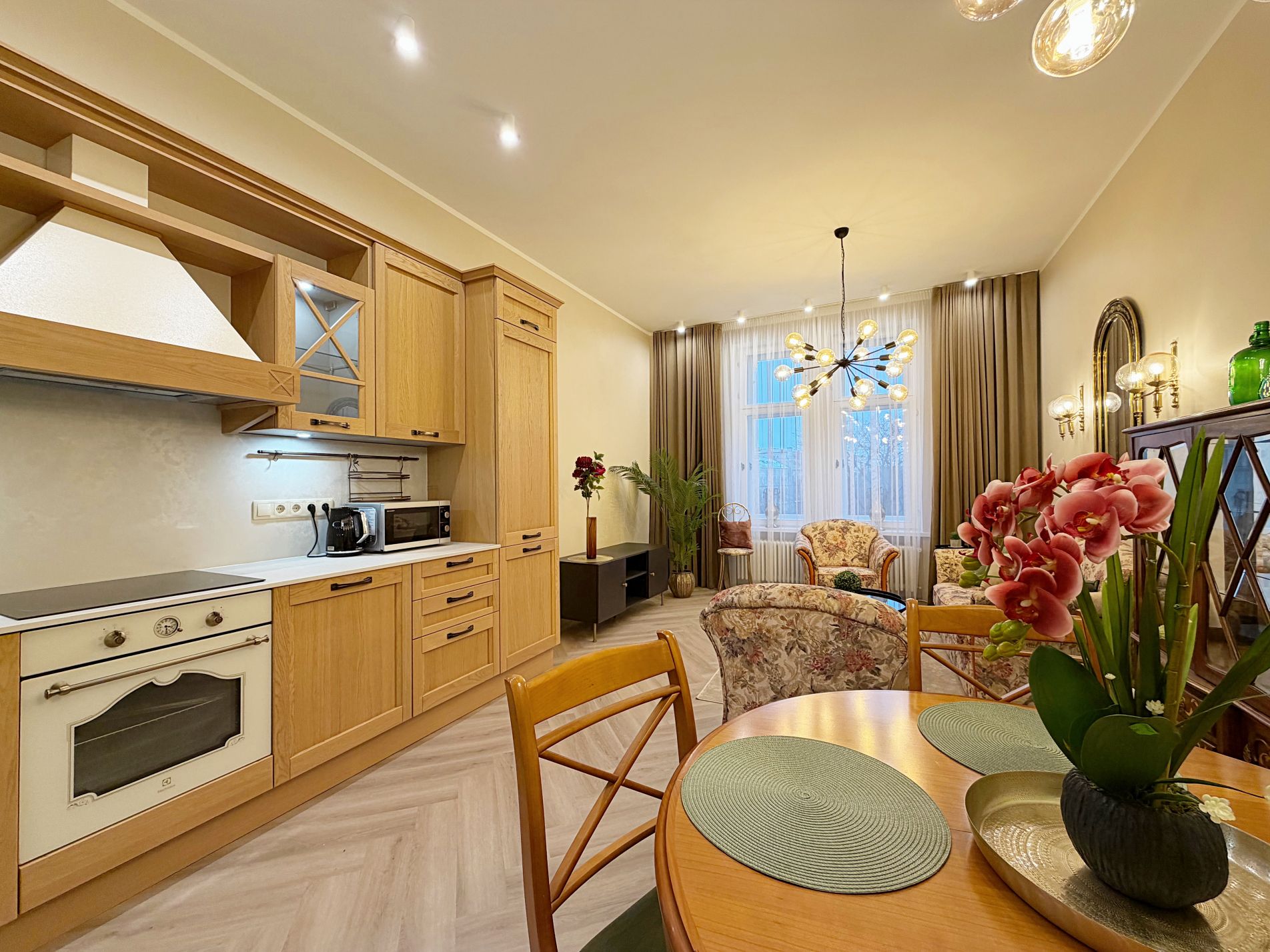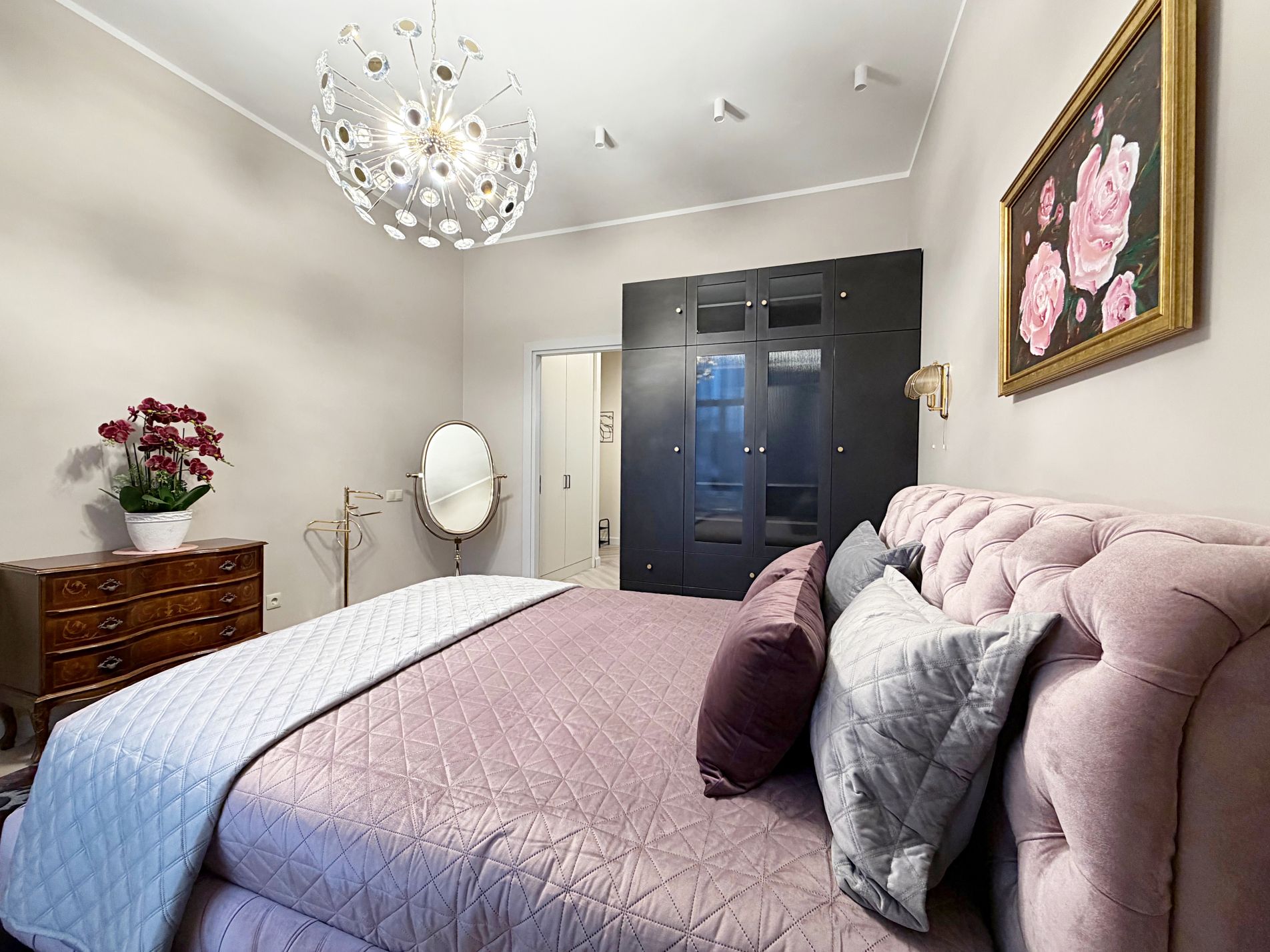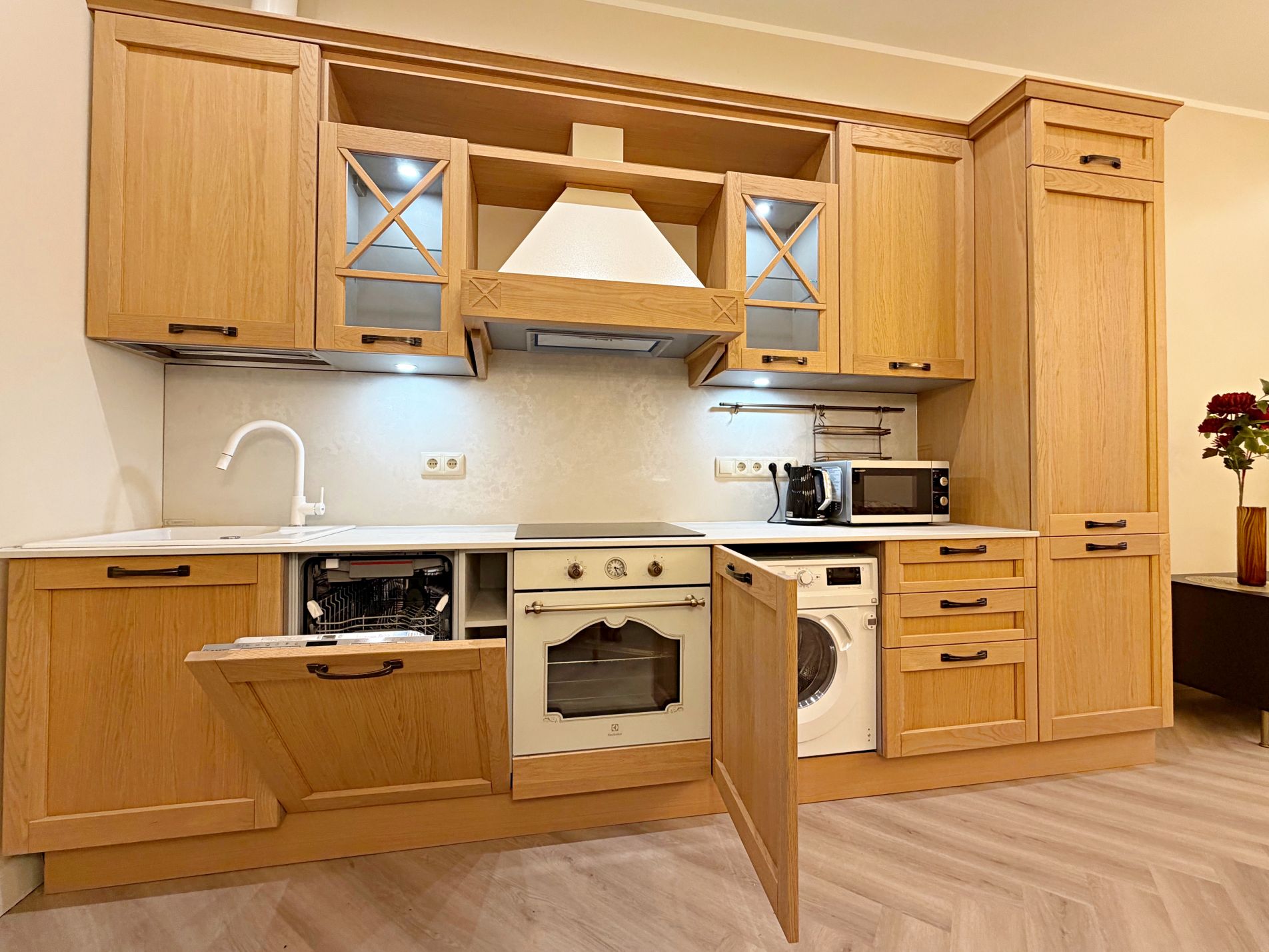 Dzīvoklis ir pilnībā mēbelēts ar kvalitatīvām un smalkām mēbelēm un iebūvētu tehniku.