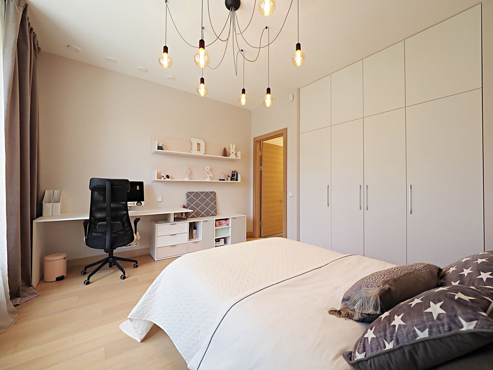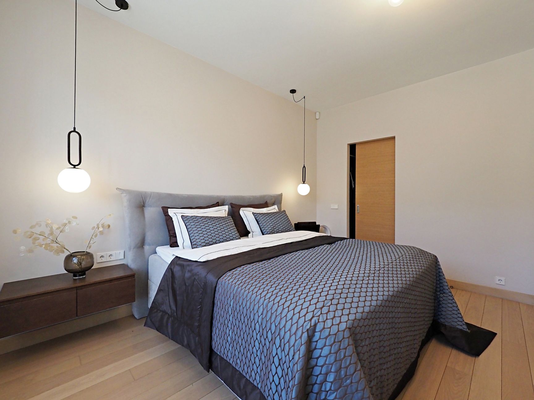 - trīs guļamistabas, galvenā guļamistaba ar savu garderobes telpu un savu vannasistabu un divas plašas guļamistabas ar iebūvēties skapjiem un viena no tām ar izeju uz pagalma terasi;