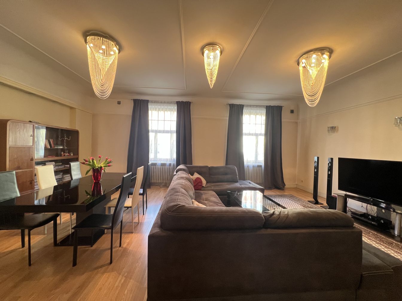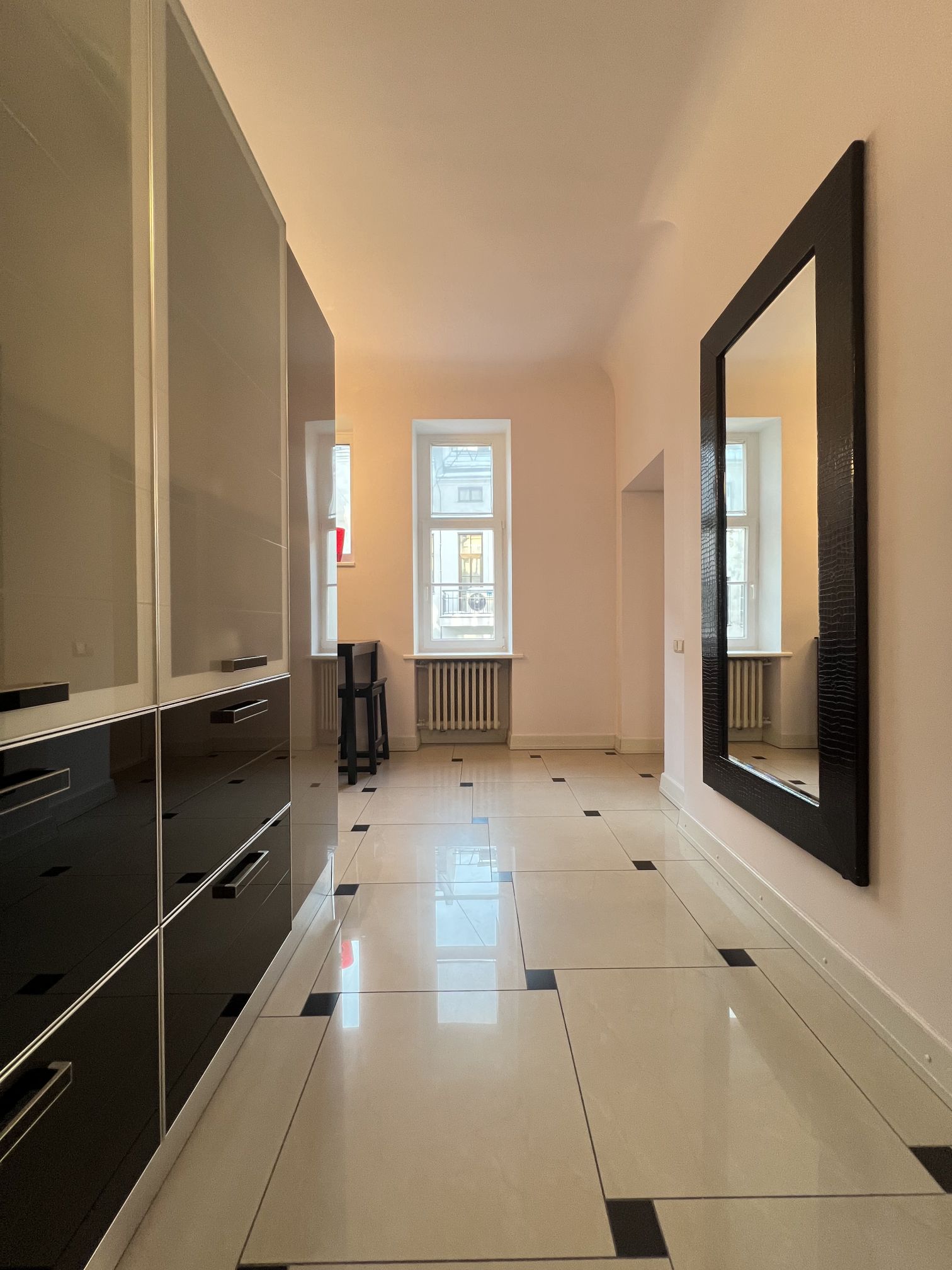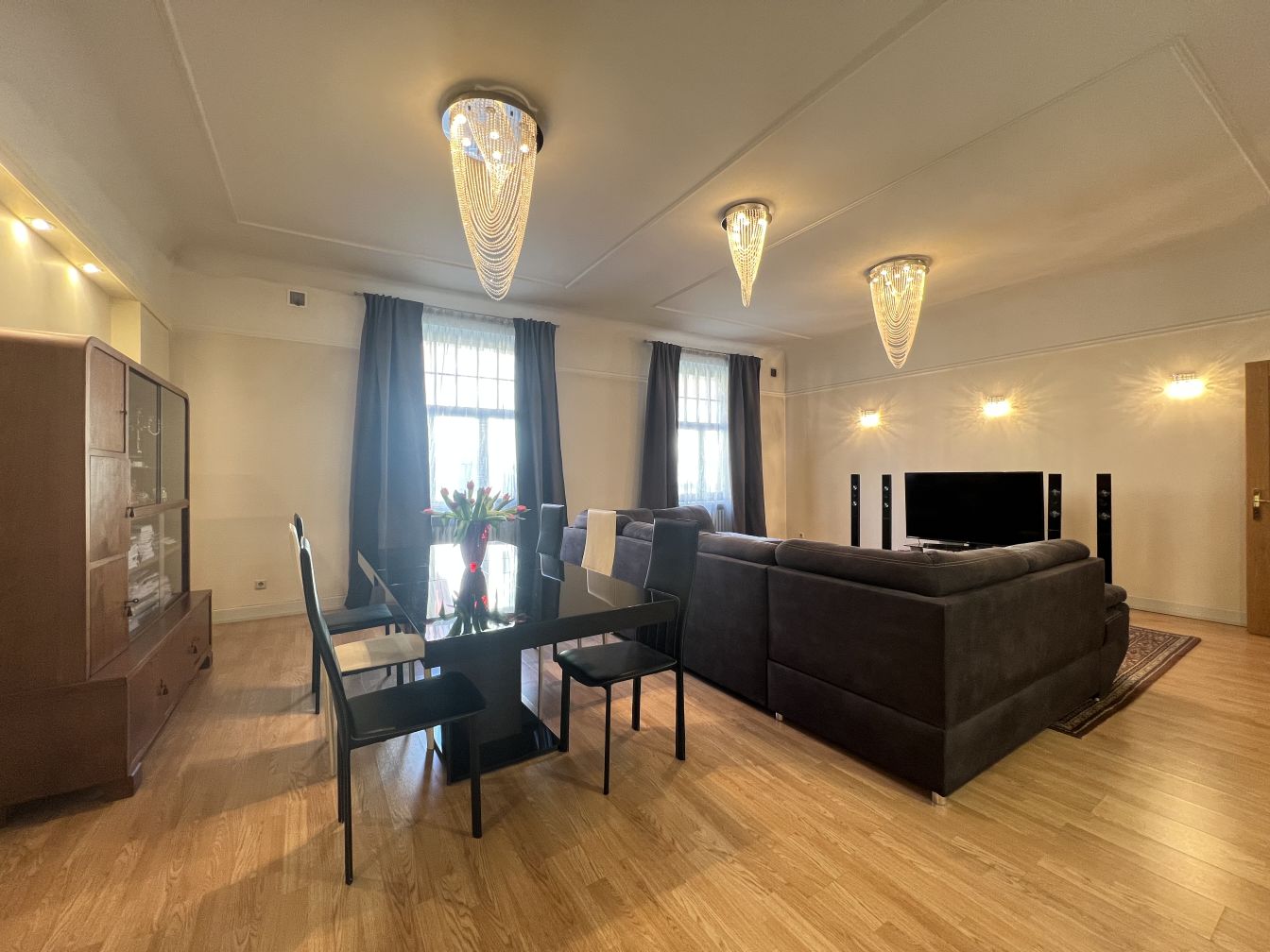 Dzīvoklis ir pilnībā mēbelēts. Kabineta dīvāns var pārtapt par divguļamu gultu, viesu izguldīšanai. Klusumu nodrošina trīskāršie logi, kas efektīvi slāpē pilsētas trokšņus. Logi vērsti uz pagalmu un Stabu ielu. Centrālā apkure, dzīvoklis ir ļoti silts. Ieeja no Brīvības ielas, mājā ir lifts. Dzīvoklim ir arī otra izeja - melnās trepes.