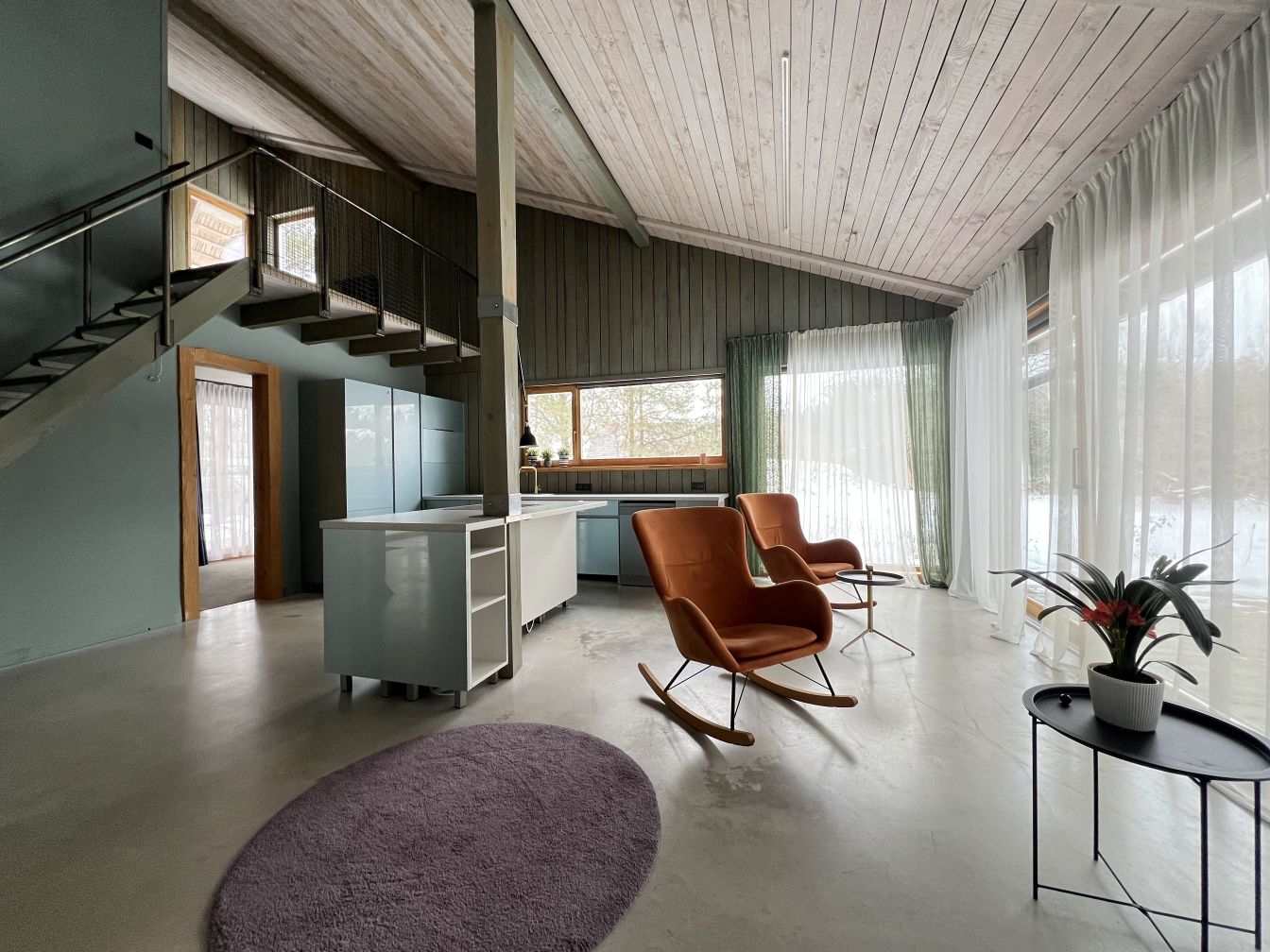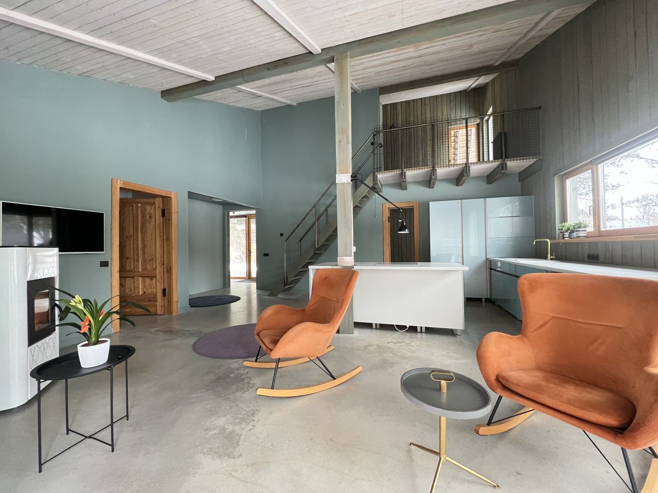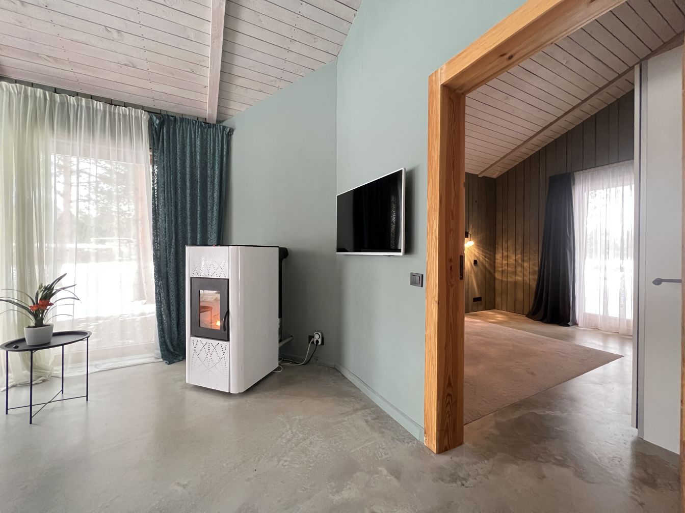 Plānojums :1.stāvā mājā ir liela, plaša viesistaba apvienota ar virtuv, kas prīkota ar visu nepieciešamo sadzīves tehniku , 2 atsevišķas guļamistabas, saimniecības telpa, vannas ar vannu. 2. stāvā ir atpūtas zona, guļamistaba ar izeju uz balkonu un vannasiatba ar dušu.