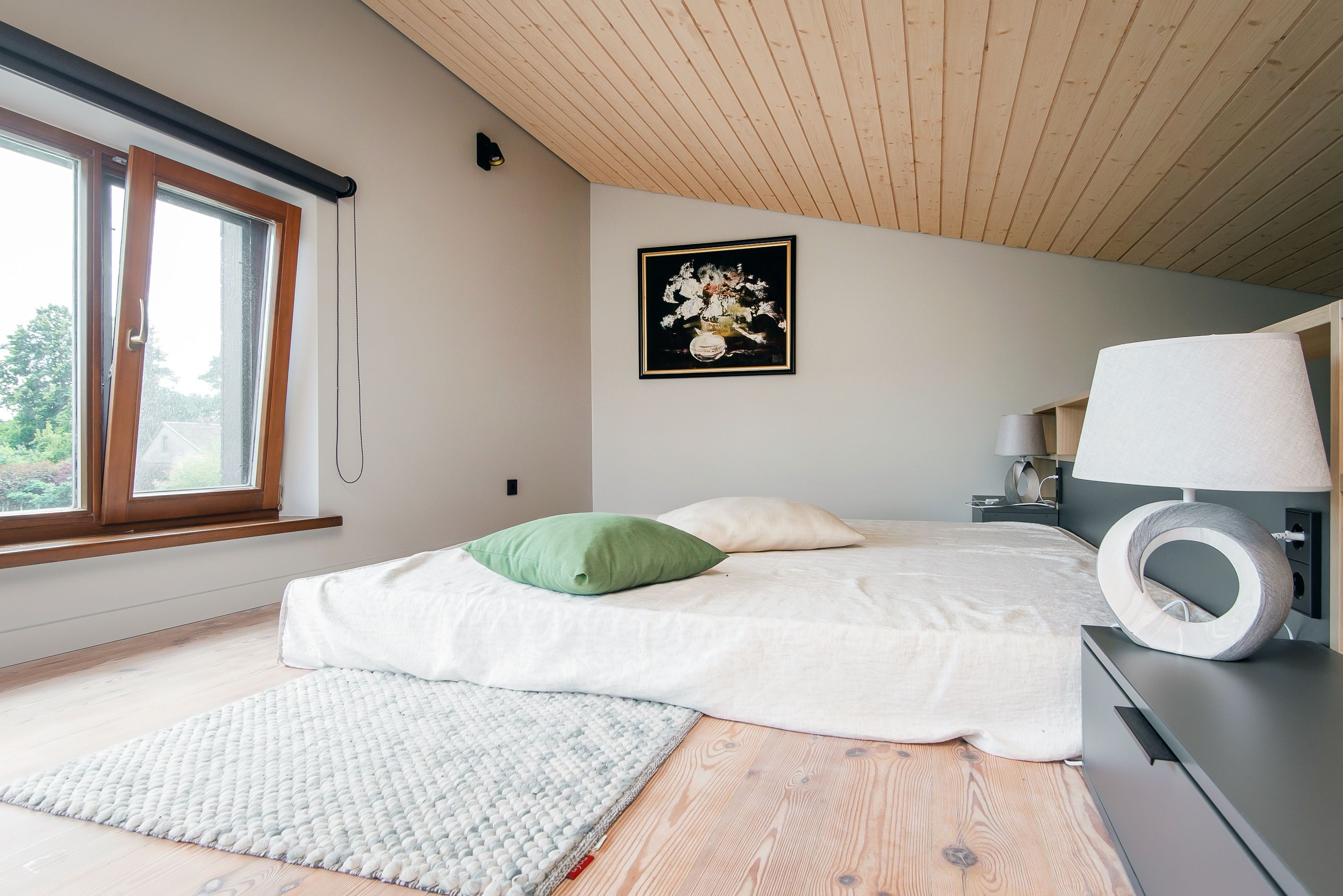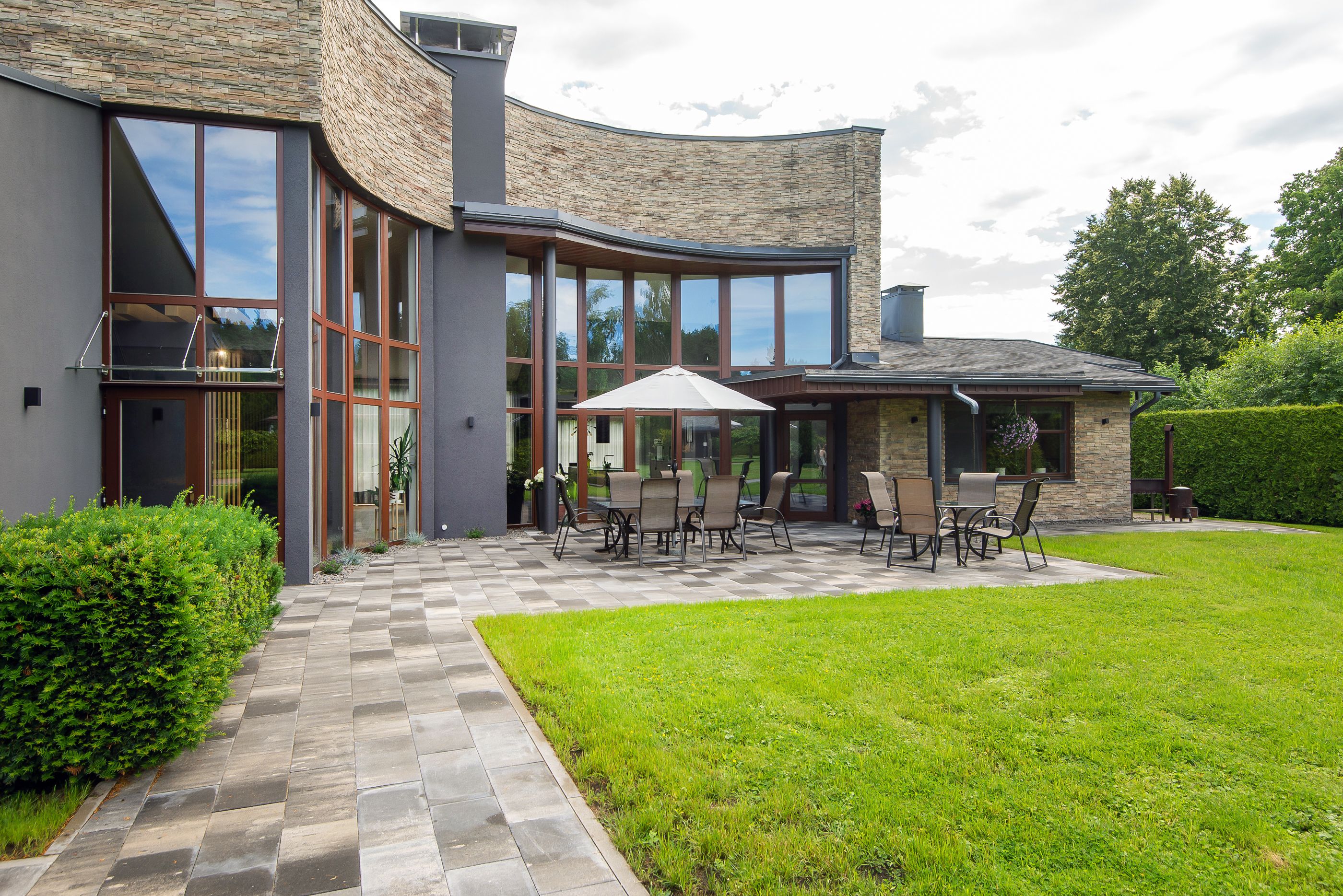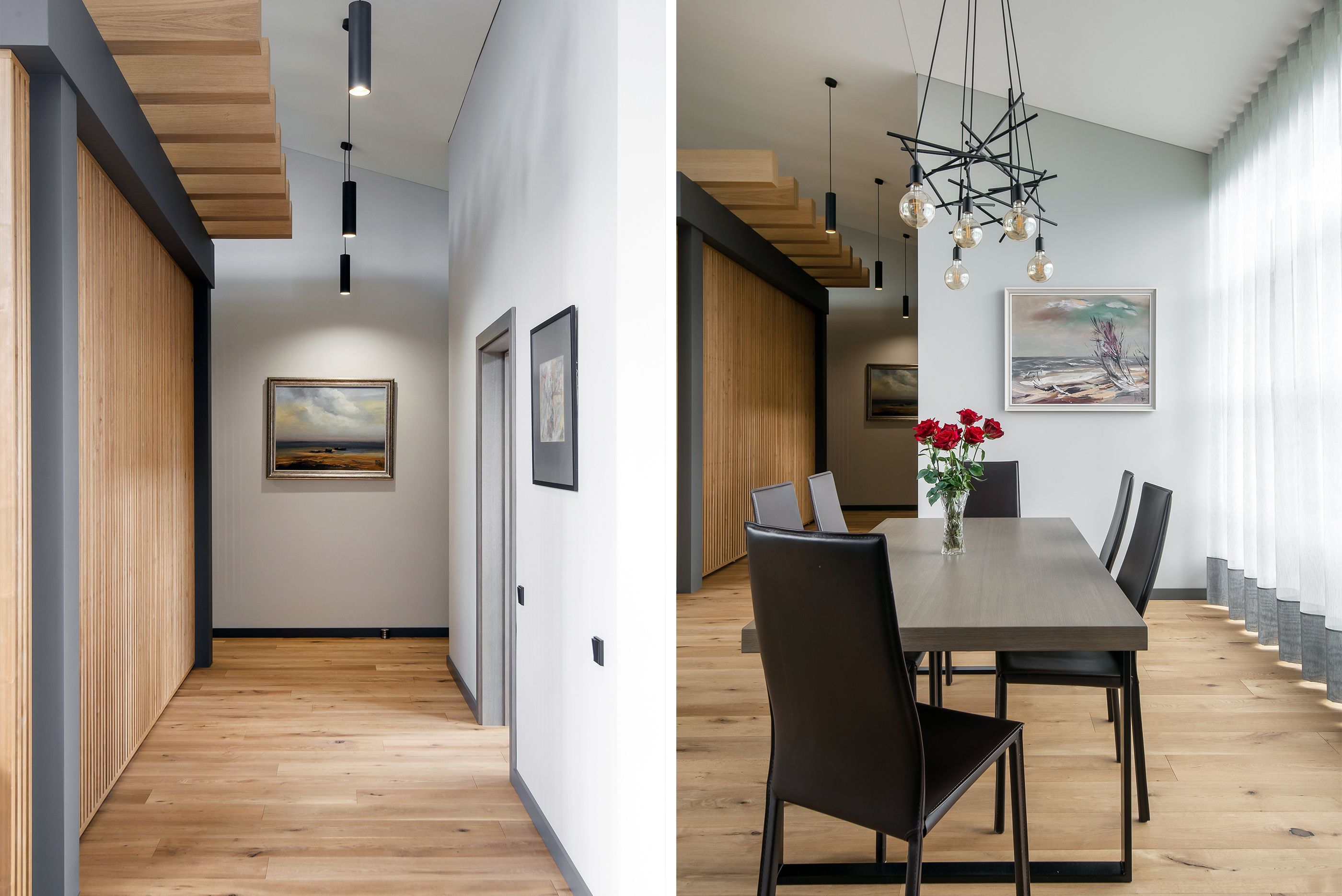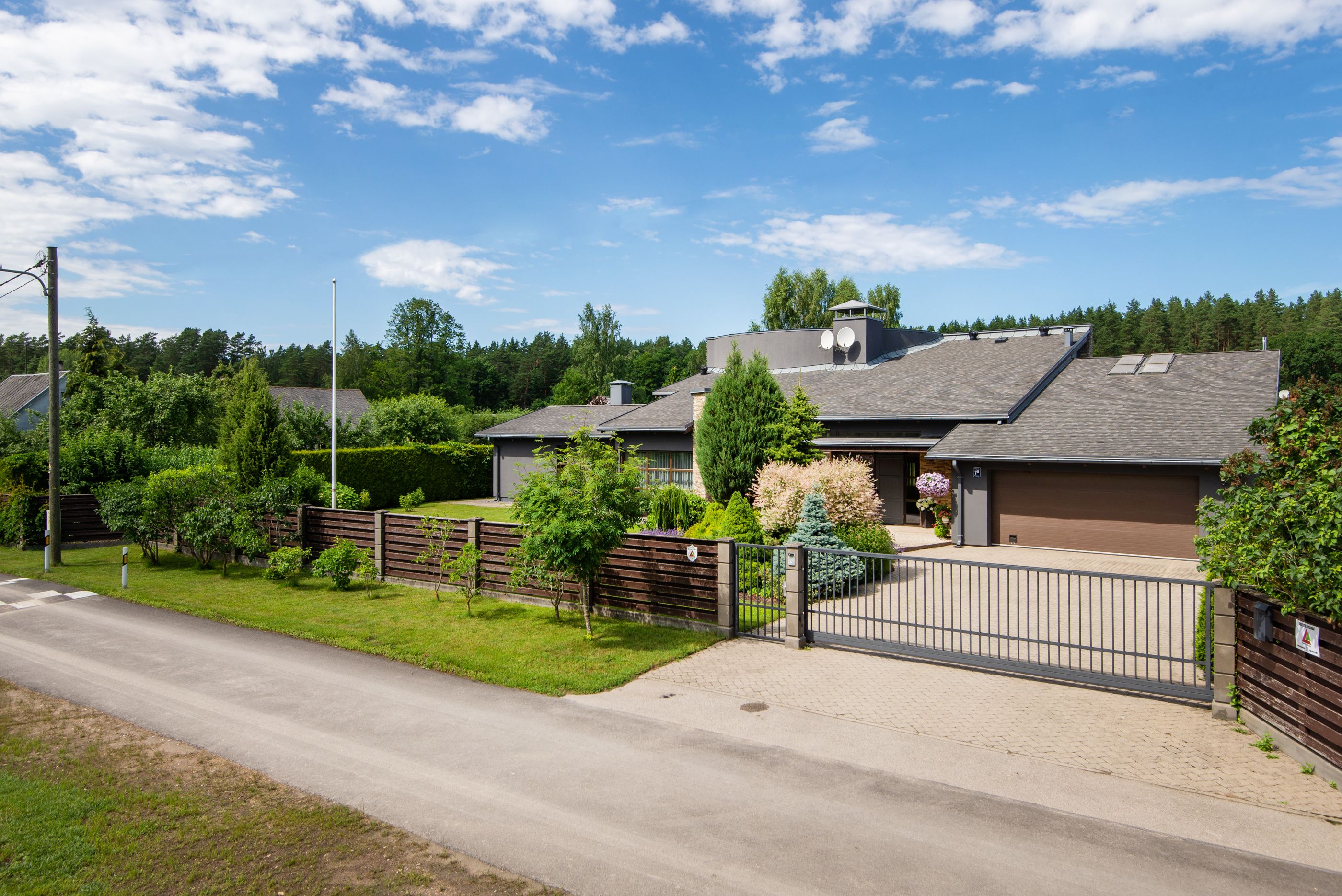 Mājas plānojums - centrā ir gaiša un plaša dzīvojamā istaba ar kamīnu un panorāmas logiem, modernu virtuvi un ēdamzonu un izeju uz terasi. Vienā daļā atrodas saimnieku guļamistaba ar garderobi un savu privāto vannas istabu un saunu, savukārt, otrā daļā ir 3 atsevišķas guļamistabas, savs sanmezgls ar dušu. Vienai no guļamistabām ir otrais stāvs.