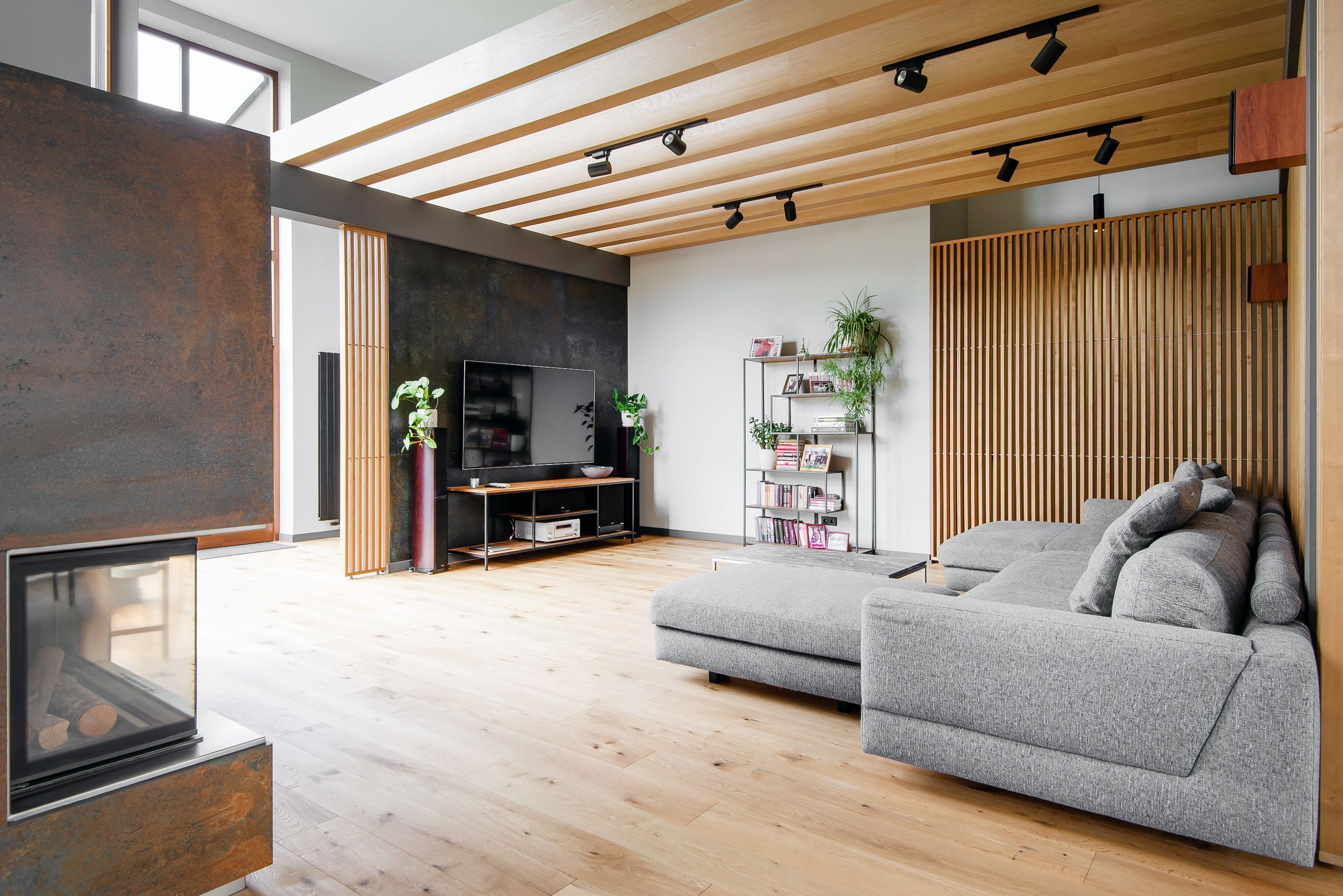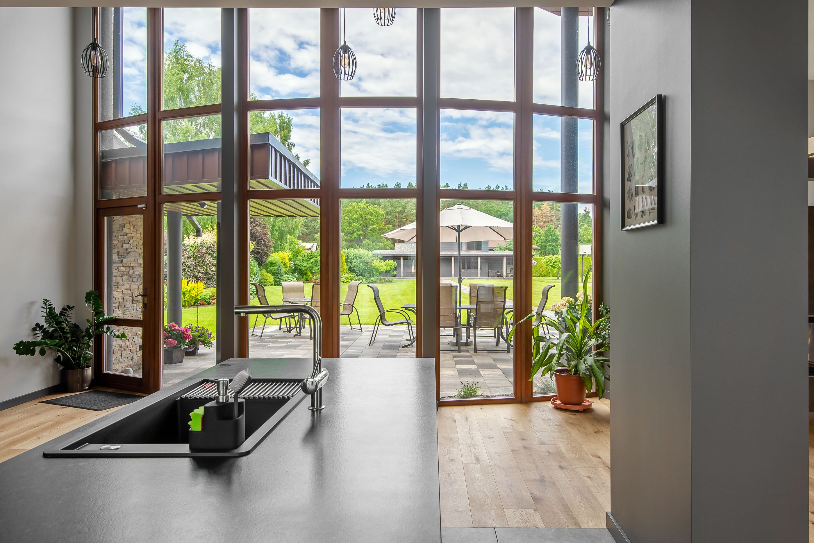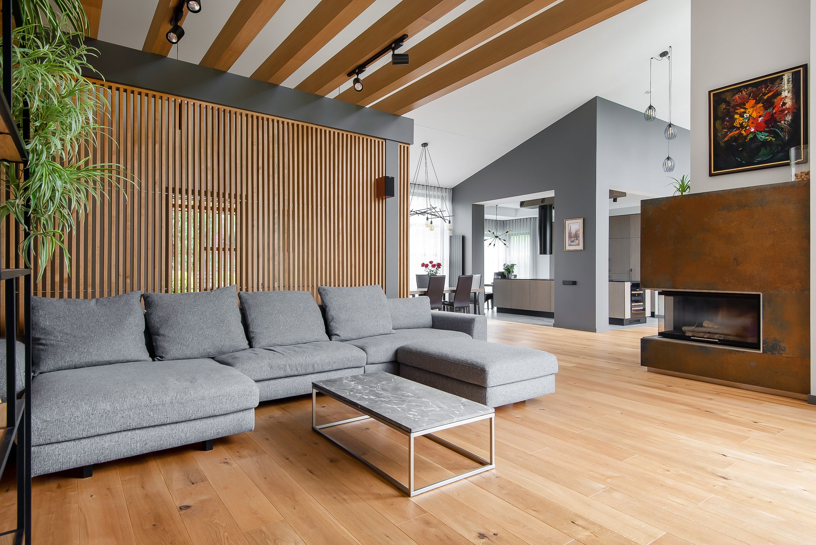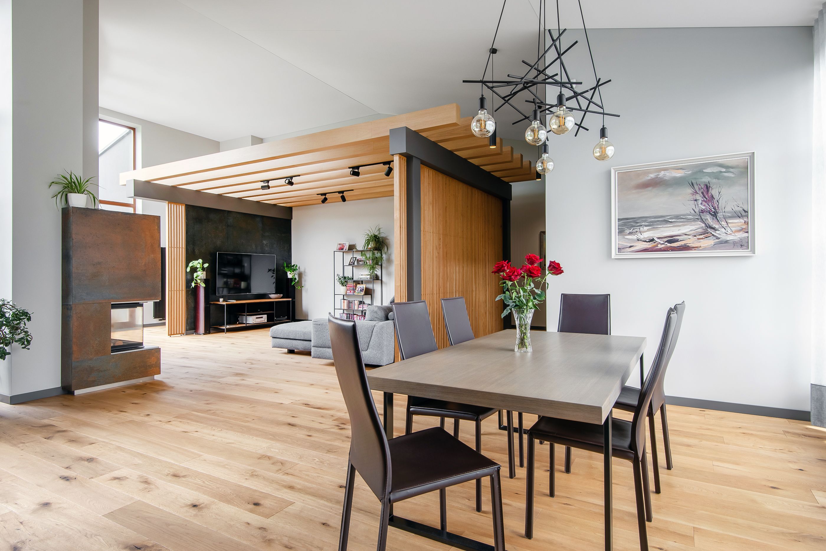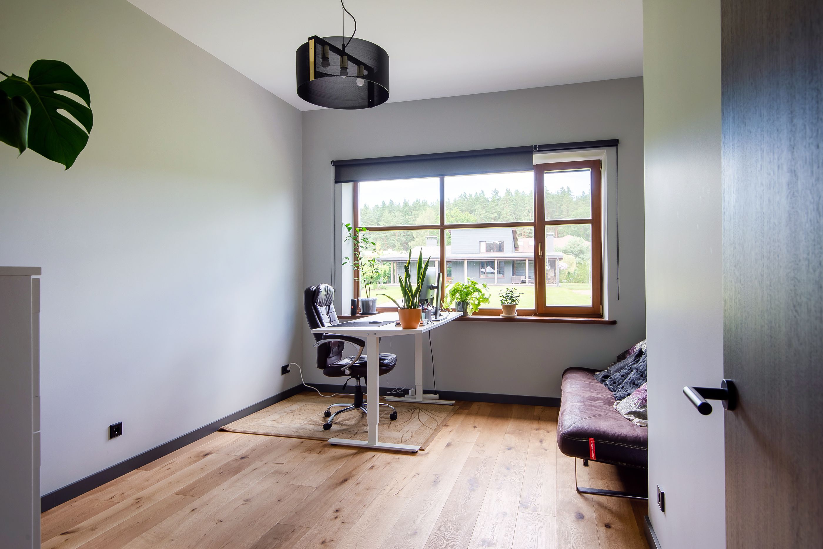 Mājas plānojums - centrā ir gaiša un plaša dzīvojamā istaba ar kamīnu un panorāmas logiem, modernu virtuvi un ēdamzonu un izeju uz terasi. Vienā daļā atrodas saimnieku guļamistaba ar garderobi un savu privāto vannas istabu un saunu, savukārt, otrā daļā ir 3 atsevišķas guļamistabas, savs sanmezgls ar dušu. Vienai no guļamistabām ir otrais stāvs.